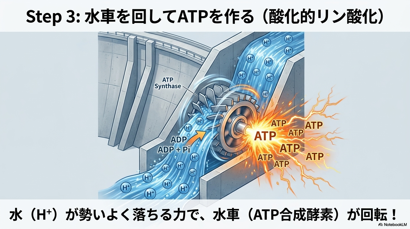 そして、そのダムに溜まったエネルギーを使って、水車(ATP合成酵素)を回し、ATPを作るという流れです。