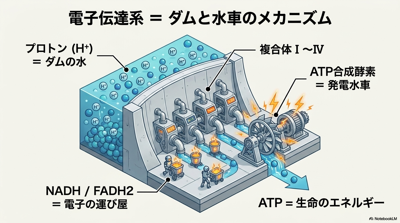 電子伝達系は一見難しそうに見えますが、「ダムと水車」のイメージで考えると理解しやすくなります。