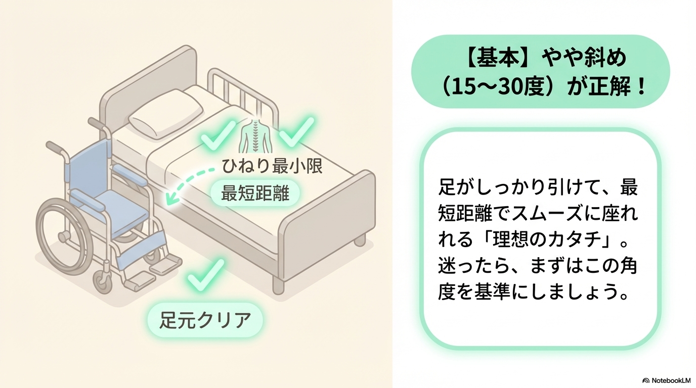 - 車椅子移乗の角度は15〜30度の「やや斜め」が基本