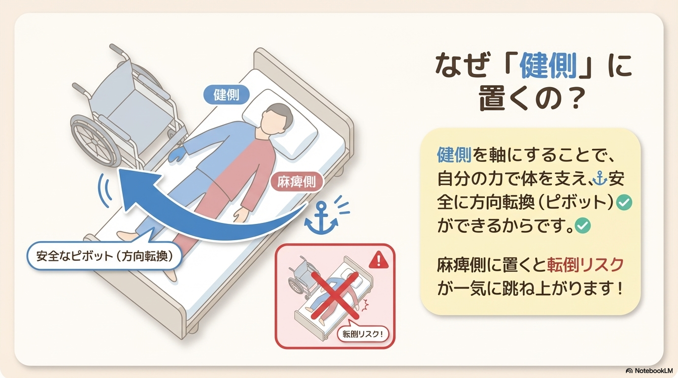 - 片麻痺では健側配置+事前準備が安全のカギ